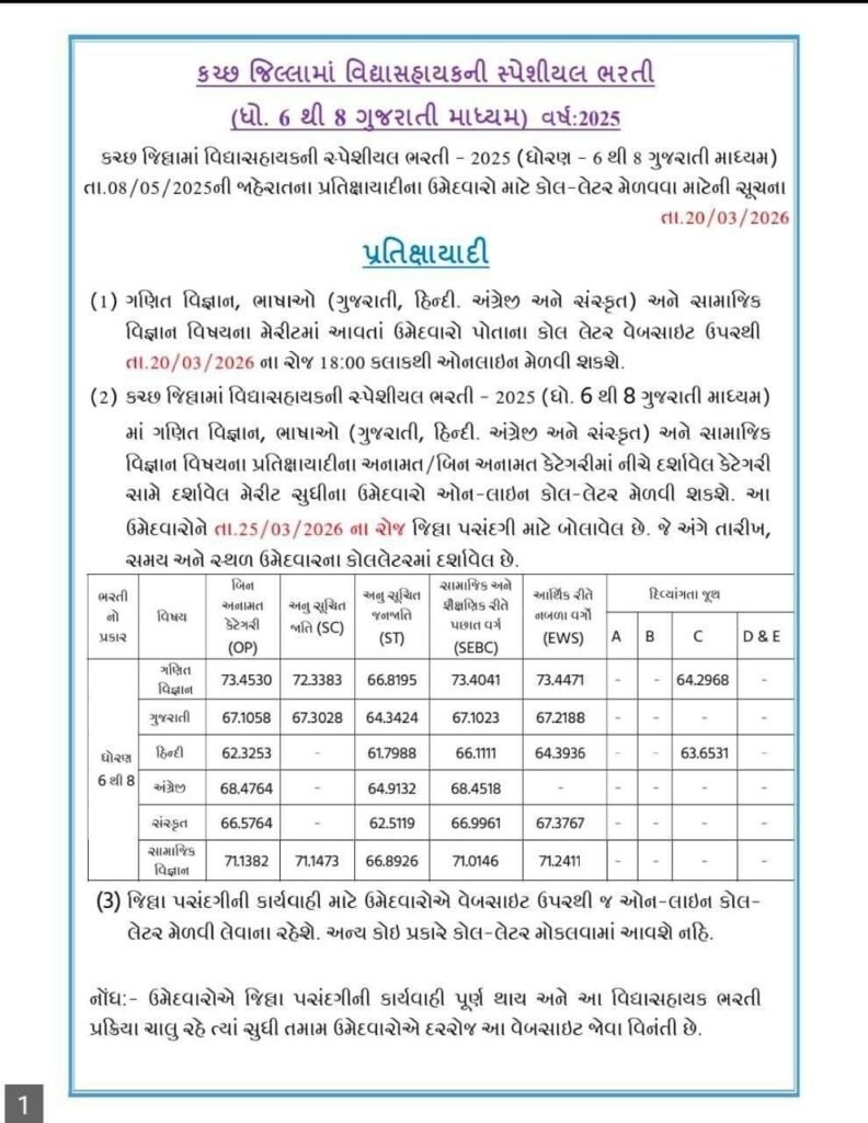 The waiting list merit candidates for subjects including Math-Science, Languages (Gujarati, Hindi, English, Sanskrit), and Social Science are eligible to download the online call letter starting from 20/03/2026 at 18:00 hours. This is a crucial opportunity for aspirants waiting for district selection in the Kutch region.